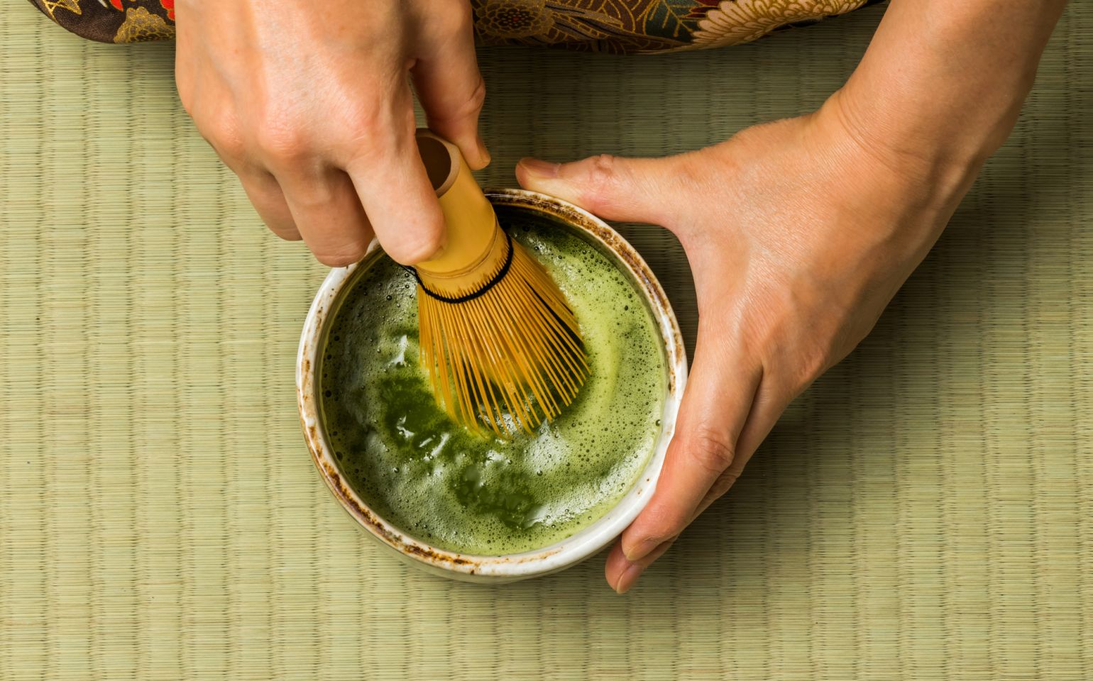 Dans un bol de cérémonie, une cuillère à thé poudre Matcha est mélangée à de l'eau chaude.