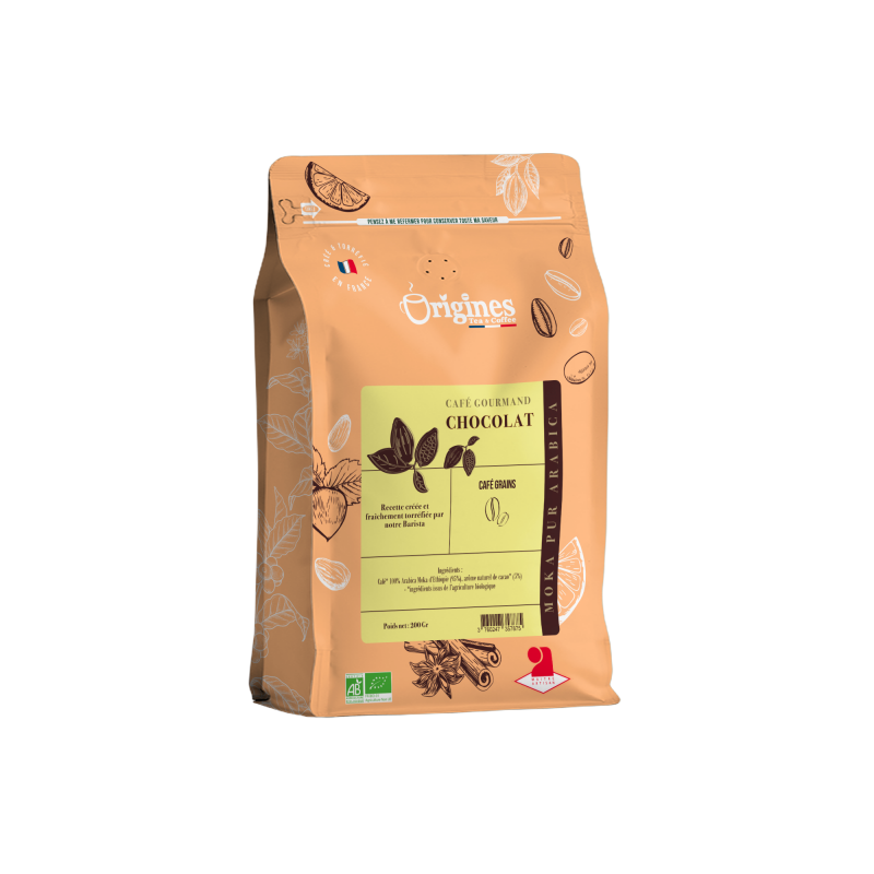 Pour notre café gourmand bio chocolat, nous avons ajouté dans le café torréfié des écorces de cacao bio ainsi qu’un arôme naturel de cacao pour retrouver ces notes douces chocolatés en bouche
