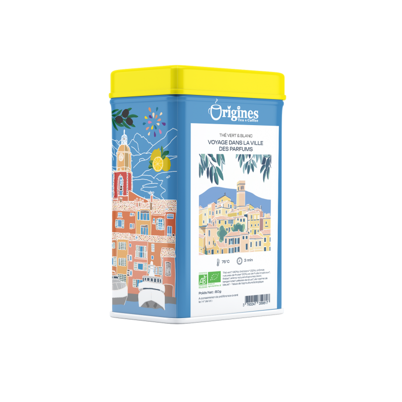 Laissez-vous transporter par Voyage dans la ville des Parfums, un thé bio d’une grande finesse imaginé pour la Collection Côte d’Azur. Ce mélange associe la douceur veloutée du thé blanc à la fraîcheur végétale du thé vert, pour une tasse harmonieuse et pleine d’élégance.