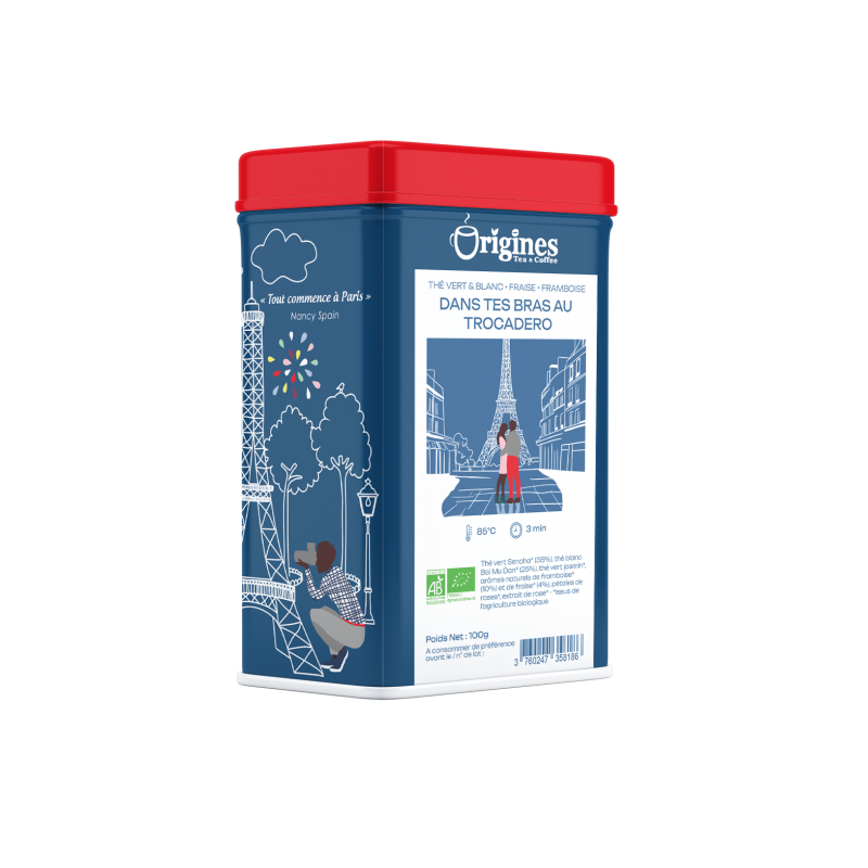 Un thé vert et thé blanc bio d’une grande finesse, délicatement fleuri et fruité. Dans tes bras au Trocadéro offre une parenthèse douce, lumineuse et élégante.